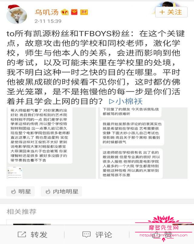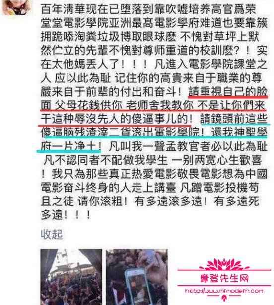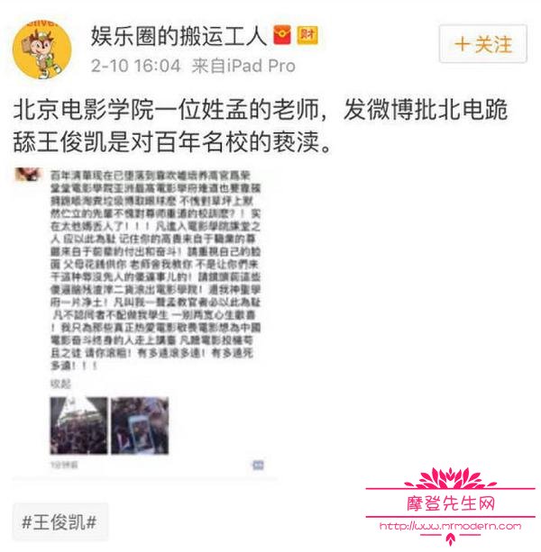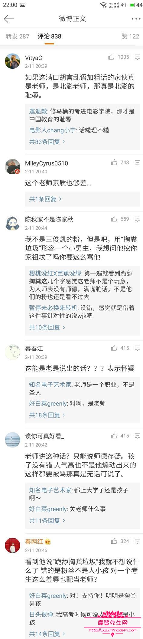 批王俊凯的北影老师是谁? 目前通过小编整理的资料来看这位北影的老师姓孟,至于叫孟什么没有更多的资料了。也就是说批王俊凯的老师是孟老师。 ![]() 王俊凯现身北京电影学院参加艺考。他身穿白色的羽绒服现身,戴着红色的围巾,造型十分亮眼。 ![]() 王俊凯在考试现场,一身白衬衫和普通牛仔裤。显得非常的精神。 ![]() 王俊凯在表演现场朗读了诗歌,有同场考试的学生表示他的现场爆发力特别好。 ![]() 但是不料考试结束后有人发出了北影老师这样的朋友圈截图。。。 对此网友言论众说纷纭。 ![]() ![]() 小编认为老师直接口出脏言确实不妥。有失一个名门高校教授该有的素质。人多并非只是王俊凯粉丝的问题,很多媒体拍到了王俊凯就会有奖金更是重要原因。对此王俊凯粉丝态度如下: ![]() 王俊凯理智的粉丝态度小编认为还是不错的,先点个赞。也希望部分不太理智的粉丝不要再替你们的爱豆得罪他以后的校友,老师固然有失风度,然多个朋友多条路,眼前留一线日后好相见,忍一时风平浪静,退一步海阔天空。也提前祝福王俊凯艺考能够取得好的成绩,考上自己心爱的学校。 王俊凯的女朋友是李佳宁吗? 网传tfboys王俊凯女朋友叫李佳宁,不仅长得漂亮还是名副其实的富三代,父亲从事房地产生意家产丰厚,既有淑女的甜美又有女汉子的精神,是个才貌双全的女孩。据说,当初还是李佳宁主动追求王俊凯的。女追男的浪漫爱情并不少见,知情人爆料,李佳宁初次认识王俊凯也是在电视荧幕之上,不料二人学校距离非常近,某日放学李佳宁鼓起勇气向王俊凯表白,于是就有了相遇相识相恋的一个完美邂逅。不过对于此传闻,王俊凯本人并没有承认过,至于是真是假就不知道了!王俊凯作为tfboys的队长,虽然年纪小小的,还是一个15岁的少年,但是王俊凯外表俊朗,特别是能歌善舞,在唱歌方面可谓无师自通,算是一位非常成功的明星了,在此也祝我们的小鲜肉能越走越红。