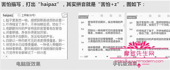 举个例子,如果想要描写人的眉毛,只要输入“meimao+z”,便会跳出好几页的内容,描写都很言情,例如“在他眉峰的皱蹙之间,隐隐蕴藏着一股杀气、一股风雷”等。