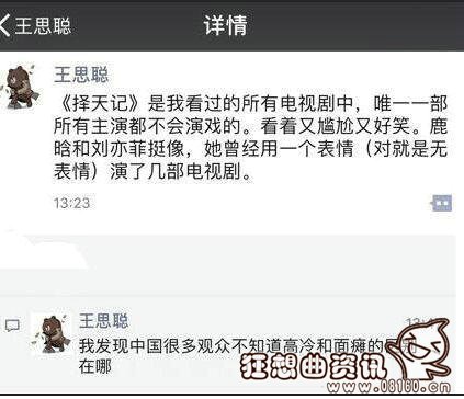 近日,《择天记》热播,在粉丝纷纷热捧的时候,对主演演技的评论新鲜出炉!其中最惹眼的莫过于“国民老公王思聪”的评论!网曝王思聪发朋友圈吐槽:“鹿晗和刘亦菲挺像,她曾用一个表情(对就是无表情)演了几部电视剧。”随即又在评论里发“我发现中国很多观众不知道高冷和面瘫的区别。”思聪是真的不怕鹿晗粉丝来撕吗?