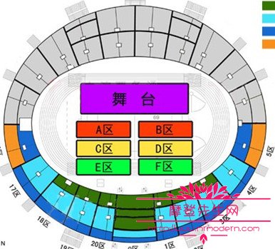 大家可以看到,一般大型的演唱会场馆,都是在体育场等圆形场地。这种场地一般都是像上图所示的那样,舞台建立在其中一方,其他三方以及中间区域是用来观看演唱会的座位,这样就造成了座位的区分。