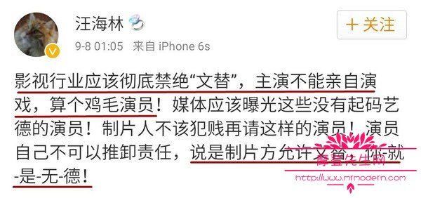 汪海林是自由编剧,最知名的著作当属《铜牙铁齿纪晓岚》了。他编剧了非常多的作品,但是人们近几日讨论的还是关于他提出的文替现象。所谓的文替就是与舞替相对应的,不需要武打动作的替身,对于文替很多人吃反对态度,包括编剧汪海林,他认为用文替绝对是不敬业的表现,而李易峰也被评价出现在频繁使用文替中。