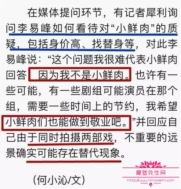 ![]() ![]() ![]() 众多前辈都觉得使用文替的现象并不值得提倡,所以李易峰说使用替身是合理的说法还成立吗? 再来说说被粉丝们吹上天的演技,不得不说演技上有进步,起码从这个镜头来看,我知道他痛了。 李易峰作为《麻雀》里面的男一号可以说是功不可没,毕竟有三千多万的微博粉丝作为支撑;再加上前不久凭借《老炮儿》中的“出色”表现,一举干掉了多位老戏骨,成功拿下百花奖最佳男配角,更是为他博得了不少关注度。 但是他文替的新闻一而再再而三的出现,使人们不得不去真正的思考他文替的事情。 ![]() ![]() ![]() |