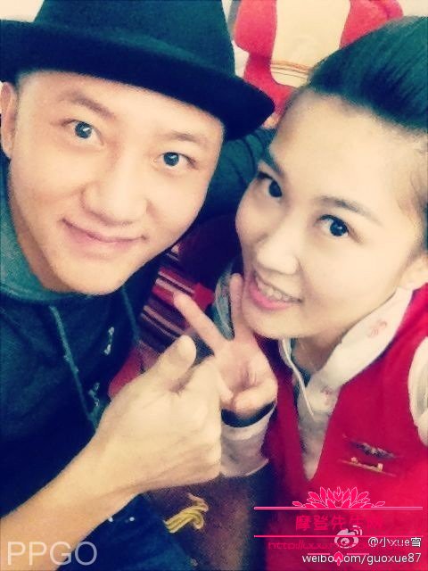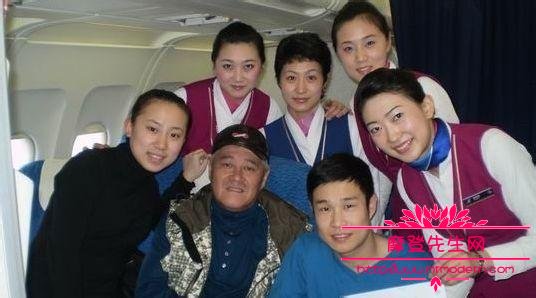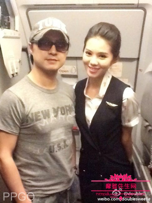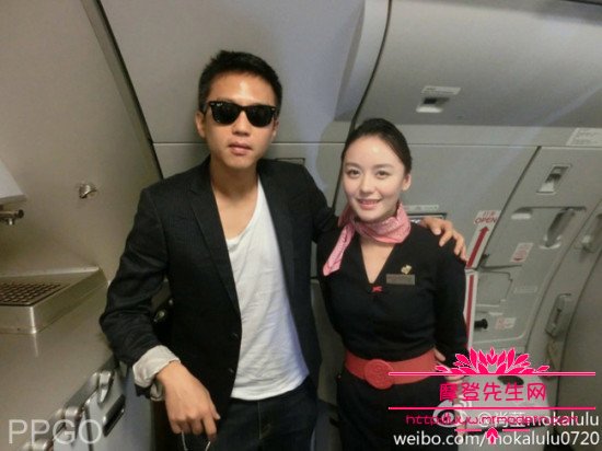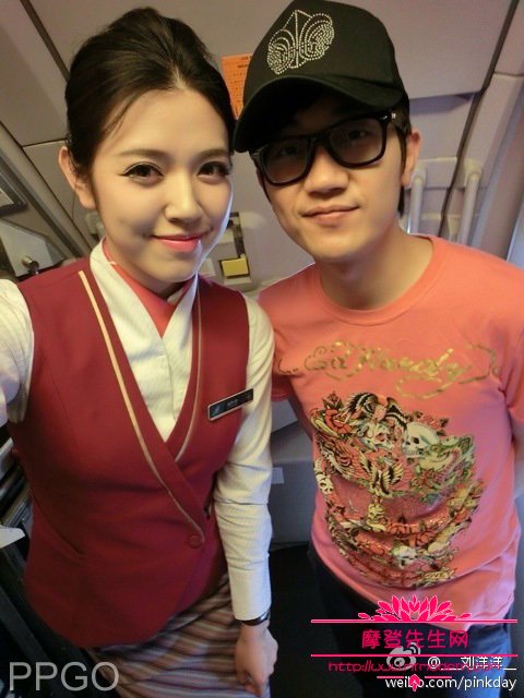 “好声音”金志文与大眼空姐合影,很配合地露出同样的笑容。
