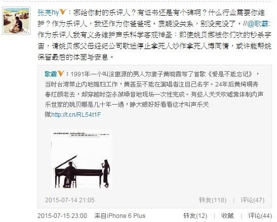 歌霸15日在微博贴出多篇文章,内容直指姚贝娜过去出席活动假唱,他分析“这世界上没有歌手能够在现场演唱时,做到100%标准音不差一个音分,除非是机器人。”文末还讽刺姚贝娜“假唱演技颇为出色”,他甚至还攻击对方的家人是“奇葩父母”,在文中直言“难怪她死不瞑目”。