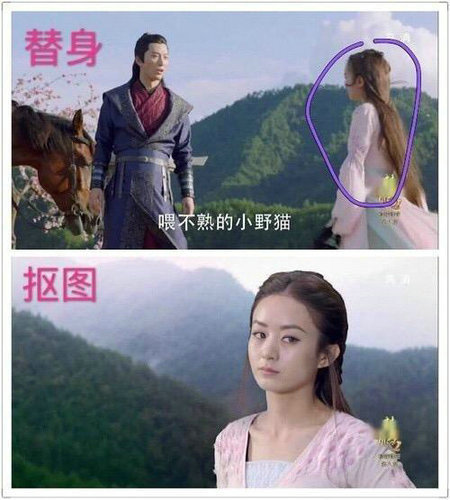 翻开网友晒出的穿帮场面,可以看到赵丽颖用替身的数量的确不少,不仅仅武打戏有用替身,连一些没有对白的躺着及跪着的镜头也用了替身。