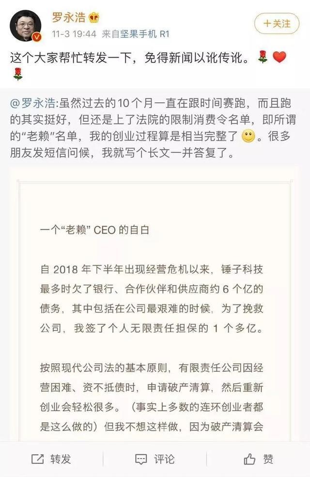 罗永浩开始直播了!在4月1日愚人节这一天,罗永浩选择了用直播来赚钱,来还自己搞锤子手机欠下的外债。很多人好奇,他做锤子手机到底欠下了多少外债??在2019年,罗永浩接受罗振宇采访的时候曾经透漏过,在2018年,他准备要发布锤子手机M系列的时候因为供应链等各方面的问题导致锤子手机欠下了外债6个亿,而罗永浩和自己的妻子一起签了一个无限责任的担保协议大约是9600万,这是实实在在压在罗永浩自己和家庭身上的债务,用他自己的话说就是即便是罗永浩死了他妻子也得还这些债务。