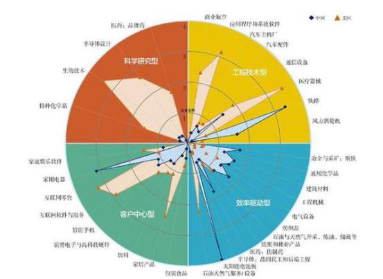 先让我们来看看中美两国的综合科技和创新能力有多大差距,上面这张图是中国和美国在33个工业领域的科技实力雷达图,图片将这33个涵盖主要工业生产的领域分为科学研究型、工程技术型、客户中心型和效率驱动型四个大类,从图片我们可以清楚的看到,目前,中国处在家用电器、建材、铁路和高铁技术、风力涡轮机和电力设备、太阳能电池板和石油天然气设备等少数领域领先美国以外,在其他20多项技术领域都远远差于美国,特别与国防技术相关的商业航空器、半导体、生物机器、特种化工和系统软件等核心技术领域,和美国差距在20至30年左右。