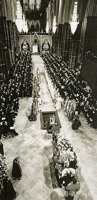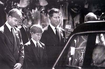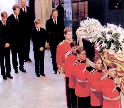 戴安娜王妃的葬礼: ![]() 戴安娜葬礼 1997年8月30日下午,英国王妃戴安娜与其男友、埃及亿万富翁之子多迪-法耶兹在法国南部旅游胜地圣托贝度假一周后回到巴黎。午夜过后,他们在巴黎里茨饭店用完晚餐后准备前往多迪在巴黎16区的私人住宅。为摆脱7名骑摩托车的摄影记者的追逐,他们乘坐的奔驰280SE3.5型豪华轿车时速高达150公里以上。 31日凌晨约零时30分,汽车行至巴黎市中心塞纳河畔的阿尔玛桥下公路隧道时突然失去控制,撞在隧道中央的一根分界水泥柱上,汽车被完全撞坏,多迪和司机当场身亡,戴安娜与她的保镖身负重伤,被送进医院抢救。追踪戴安娜的7名摄影记者随即被警方拘留。凌晨4时,戴安娜因胸部大出血在医院逝世,年仅36岁。当晚,她的遗体在查尔斯王子和她两个姐妹的护送下由专机运送回英国。 9月6日上午,戴安娜的葬礼在英国伦敦威斯敏斯特大教堂举行。当灵车驶向大教堂时,百万群众肃立沿途,向“人民的王妃” 告别。全世界十几亿人通过电视观看了葬礼。葬礼结束后,戴安娜被葬在故乡奥尔索普的斯潘塞家族墓地。 整个世界都为戴安娜的早逝叹惋。旧金山举行了万人烛光游行;汤加人用传统的守灵方式怀念她;巴黎人在出事地点放满了鲜花和悼辞,经过这里的车都要放慢速度以表示哀悼;澳大利亚的土著孩子举着横幅悼念王妃,上面写着:“你温暖了我们的心灵”......联合国秘书长安南在获悉这一噩耗后发表声明,表示: “戴安娜的死使世界的贫困者和老弱病残者失去了一个重要的人道主义的声音”。 戴安娜就这样离去了。她宛如上帝的天使,带着仁爱与至美来到人间,为充满斗争和恶行的世界带来一束善与美的玫瑰色光辉。如今她已经完成了上帝的使命羽化而去,将一个迷人的美丽形象永远定格在人们心中。 戴安娜出生于英国一个贵族家庭,她是斯潘塞伯爵四个孩子中的老三。她的父亲曾任英王乔治六世及伊丽莎白二世女王的侍从官,母亲担任过王太后的女侍从。戴安娜8岁那时父母离异,其父得到她的监护权。她早年在英国南部的一所寄宿学校念书,后前往瑞士完成学业,毕业后在伦敦当了一名幼儿园保育员。 1977年,戴安娜在一次打猎聚会上与威尔士亲王查尔斯相识,颇得亲王青睐,并于1981年2月24日与之订婚。1981年7月29日,戴安娜与查尔斯在伦敦圣保罗大教堂举行了举世瞩目的盛大婚礼,随后她被封为威尔士王妃。婚后一年多,戴安娜生下了威廉王子, 1984年又生下了哈里王子。 婚后的戴安娜生活并不如意,王室的繁文缛节与她自然活泼的性格格格不入,查尔斯对她在公共场合每每风采夺人也心有不悦。1985年王储夫妇不和的消息首次传出,次年查尔斯恢复了他和老情人卡米拉的关系,使戴安娜受到极大屈辱。她并没有为了保住王妃的头衔而忍气吞声。她尊重自己的人格和内心感受,像任何女人一样,面对丈大的不忠表达愤怒并进行抗争。在努力失败后,她试图再生一个孩子来挽救婚姻,但未能如愿。她在绝望中甚至企图以自杀的方式来引起查尔斯的注意。1992年12月9日,英国首相梅杰在议会宣布双方正式分居。分居后的戴安娜心力交瘁,与皇家卫队少校、她的骑马教练休伊特发展了一段恋情,后者竟为300万英镑将两人的关系公诸于众。在1995年的一次电视记者采访中,戴安娜公开承认了这一恋情。对于一个女人来说,这的确需要极大的勇气,也再一次证明了戴安娜真实和自然的生活准则。1996年7月12日查尔斯和戴安娜达成离婚协议,结束了 15年的婚姻。 戴安娜虽然不受王室欢迎,但却受到百姓的爱戴。她亲切和蔼,热心公益事业,赢得了广泛赞誉。无论自己的婚姻生活有多么不幸,她在大众面前总是笑容可掬,把热情和体贴带给那些不幸的人们。她与英国100多个慈善团体有联系,是6个慈善团体的主席及英国红十字会的顾问。她富于爱心和同情心,与艾滋病患者和麻风病患者握手,在津巴布韦为难民分发食品,在萨拉热窝访问战争致残的儿童,在纽约拍卖自己的服装为抗艾滋病和抗癌协会筹款……就在去世前的三个月她还访问了波斯尼亚,身穿防护服走在插有骼髅标记的雷区旁的小路上,为国际性禁止地雷运动作宣传。这一切使她赢得了“和平王妃”的尊称。 1981年,戴安娜身披白色婚纱走进伦敦圣保罗大教堂,与英国王储查尔斯喜结连理,全世界数亿人观看了这一盛仪。16年后,这位“灰姑娘”因车祸魂断巴黎,使世界震惊。戴安娜-斯潘塞以她36岁的短暂生命,高贵迷人的气质和爱情悲剧的人生,为2 0世纪书写了一部美丽的童话。 ![]() 戴安娜遇难现场 ![]() 被撞坏的戴安娜乘坐的奔驰S280型汽车 ![]() 戴安娜的葬礼。左起是她的两个儿子及前夫查尔斯王子 ![]() 戴妃的葬礼在威斯敏斯特大教堂举行  |