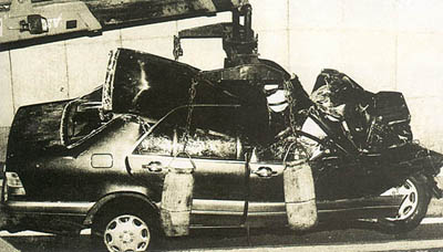 突然阿尔马桥下隧道前而出现急转弯,由于车速实在太快,已经无法控制,轿车一下子便撞到隧道隔带的立柱上,接着翻滚着撞到右墙,最后摔了回来,停在车道中央。汽车受到如此强大的冲力,几乎变成一堆废铁。司机保罗与多迪当场身亡,戴安娜坐在后座,也受了重伤。