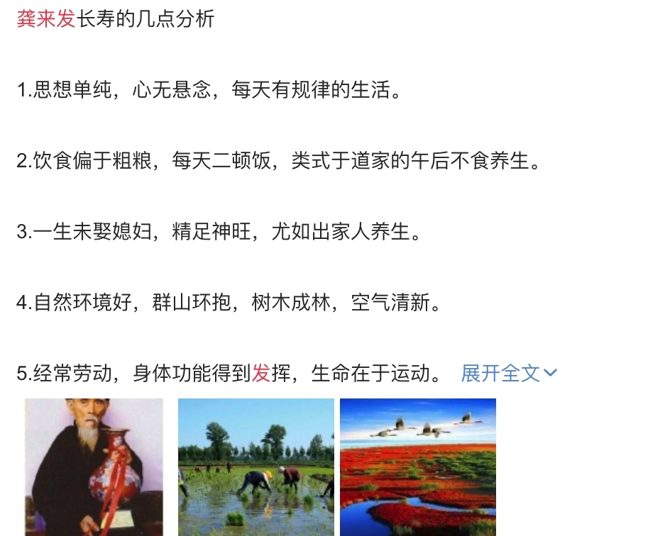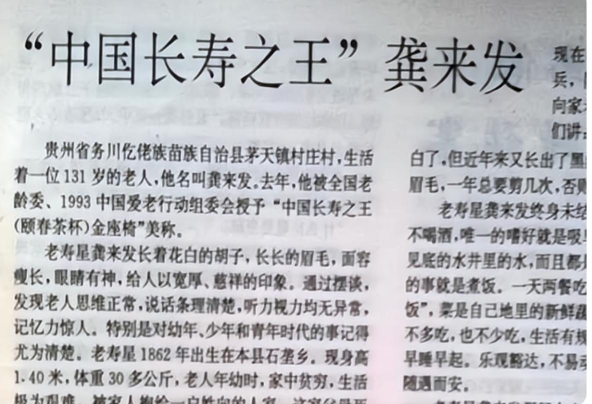 中国有句俗话叫做“人到七十古来稀”,古代人类的平均寿命不到五十岁,甚至在有些年代,平均寿命只有三、四十岁,因此古人的婚育年龄都是非常小的,随着时代的进步,人的寿命也在逐渐增长,现在活到七八十岁已经很常见了,不过活到百岁的人还是少数,比如说龚来发,就曾经引起过轰动。 龚来发其实只是个普通人,他唯一特别的就是寿命,据媒体报道,龚来发是贵州遵义务川县茅天镇人,他是少数民族仡佬族,出生于同治年间,经历了同治朝、光绪朝和溥仪朝,至清朝覆灭,再到民国、中华民族共和国成立、改革开放,直到九十年代才去世。那么龚来发活到多少岁才去世的? 从报道上可以看出,龚来发是1862年出生的,直到1995年3月才去世的,所以他活到133岁,活着的时候被中国老龄委授予“中国长寿之王”的称号。所以这个年龄应该是真实的,毕竟是官方认可过的,主要是因为龚来发活的岁数太大,因此才会引起人们的怀疑,那么龚来发长寿的秘诀是什么? 其实龚来发的生平是非常简单的,他一生都是在山里生活,因为一生没有结婚,所以也没有儿女,他不喝酒,也从不吃药,饮食也十分清淡,都是一些当地人吃的粗粮,而他最大的爱好就是抽烟,是老式的土烟,据说龚来发的竹烟杆陪了他一百多年,而他长寿的原因,很可能和他的生活习惯、饮食习惯有关。不过最重要的是龚来发的身体十分健康,所以才能活得那么久。