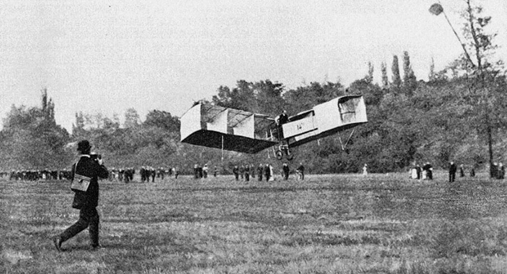 在钻研数年后,杜蒙特终于设计出了一种他取名为“14bis”的飞机。按照现代人的眼光,当年杜蒙特乘坐的这架双翼飞机显得有些笨拙,飞机的骨架由铝和竹子做成,上面蒙有丝绸,一个24马力的发动机装在飞机的尾部,导航装置突兀地安放在前端,杜蒙特本人则站在一个篮子里。1906年7月,飞机首次试飞,但没有成功;9月7日,飞机终于离开了地面,但仅支持一会儿。1906年10月23日下午,当发动机的功率增至50马力后,在数千名巴黎人的目睹下,飞机升到3米空中,足足飞了60米。