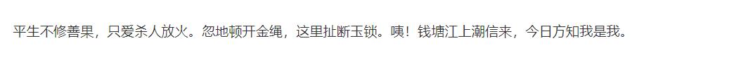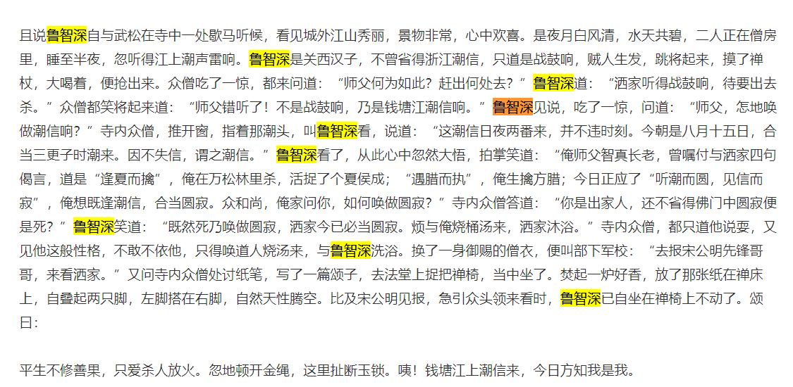 鲁智深之大名想来国人都是无人不知的,在《水浒传》中,他是名气最响亮,故事最振奋,性格最刚烈,为人最义气,结局也是最全乎的。到了最后,水浒很多好汉都死的死散的散,鲁智深却是立下战功,于杭州六合寺圆寂,还被追赠为义烈昭暨禅师,在他圆寂的时候,留有一首诗,可算是诠释了他的一生写照,那么这首诗是什么,另外他怎么突然就圆寂了? 鲁智深圆寂时的一首诗是什么, 鲁智深圆寂的时候,有一首诗,是这样写的:平生不修善果,只爱杀人放火。忽地顿开金绳,这里扯断玉锁。咦!钱塘江上潮信来,今日方知我是我。这首诗出现在《水浒传》书中的第一百一十九回,鲁智深是走到了自己的结局,并且即将圆寂的时候,回顾自己的一生,给自己的人生写下了批语。 这首诗很简单也很直白,将鲁智深的性格,不修善果,杀人放火写明,之后又是挣脱俗世名利,扯断周身束缚。似命运的安排一般,如钱塘江的潮水在固定的时刻来临,在机缘应招之下,了断了自己的尘缘,这时明了了自我,开悟了佛境,知晓了自性。 他怎么突然就圆寂了? 鲁智深突然就圆寂了,主要是因为《水浒传》作者的杜撰,为小说注入了一些宿命安排,因果了悟,在书中鲁智深听到僧人说了圆寂的意思之后,就笑着说,圆寂既然是死去的意思,那么我今日必要圆寂,麻烦僧人们给烧点水,我沐浴一下。如此沐浴过后就真的坐着禅椅上圆寂了。 鲁智深对于自己的圆寂是真的顿悟了,这里小说大概是要给鲁智深一个圆满的结局,鲁智深在听到外面战鼓声响,而僧人们讲说是钱塘江潮信响,后僧人们讲述潮信规律之后,顿时就大彻大悟了,自己一生杀戮,合该是要此时圆寂了。