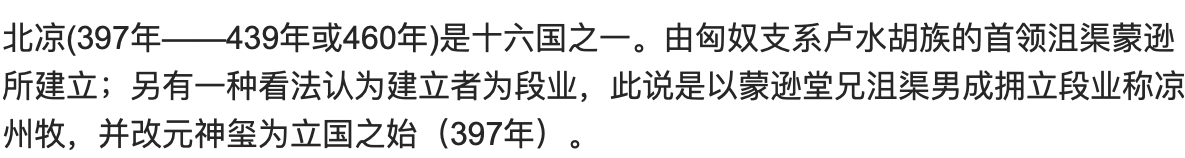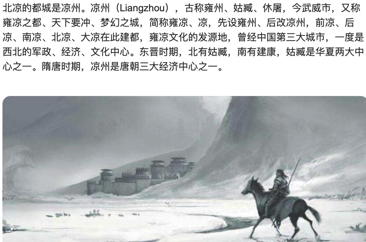最近由小说改编的电视剧《雪中悍刀行》正在热播,这部剧虽然热度很高,但随之而来的则是一些争议,比如说武打部分略显敷衍,还有就是剧中的一些改编,比如说把北凉改为北椋,那么这是怎么回事? 因为《雪中悍刀行》原著的故事背景设定在北凉地区,男主是北凉王世子徐凤年,因为是男频爽文,所以这部小说是非常精彩的,也因此原著粉是很多的,因此电视剧中把北凉改为北椋,才会让原著粉感到不满,其实之所以会有这样的改编,是因为中国古代真的有北凉这个政权,所以为了过审,才会在电视剧中把北凉改为北椋。 北凉是十六国时期的一个政权之一,也是最后一个十六国政权,始建于公元397年,创建者是段业,不过在沮渠蒙逊手中发扬光大,在沮渠蒙逊死后,其子沮渠牧犍继位,公元439年北魏围攻北凉王城,沮渠牧犍无奈之下选择投降,北凉至此灭亡,后来沮渠牧犍的兄弟在高昌重新建立了北凉政权,史称高昌北凉,不过这个政权也没有存在多长时间就灭亡了。 沮渠蒙逊即位后,把北凉定都姑臧,所以从狭义的角度来说,北凉指的是姑臧,也就是现在的甘肃省威武市凉州区。而从广义上说,北凉指的是其政权控制下的地区,包括甘肃西部、宁夏、新疆以及青海的一部分地区,也就是古时候的河西一带,因此沮渠蒙逊也被称为河西王、凉州牧。北凉灭国后,标志着十六国政权的结束,也标志着中国南北朝时期的开端。