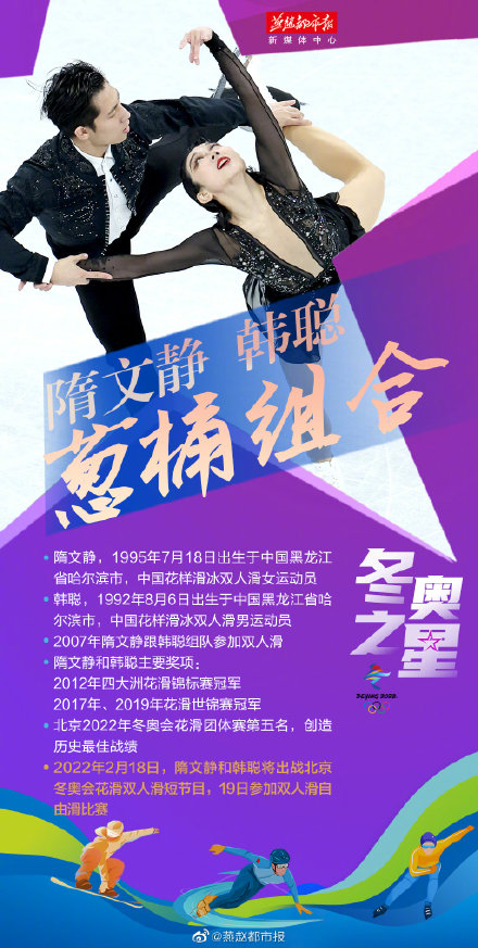 花样滑冰世界冠军隋文静韩聪。二人自2007年起搭档,2010、11、12年世界青少年花样滑冰锦标赛冠军;2012、14、16、17、19、20年四大洲花样滑冰锦标赛冠军;2015、16年世界花样滑冰锦标赛亚军;2017、19年世界花样滑冰锦标赛冠军;2018年平昌冬奥会亚军。2022年2月18日,两人晶参加花样滑冰双人短滑节目,19日参加双人滑自由滑比赛。期待在家门口,两个人能有较好的表现!