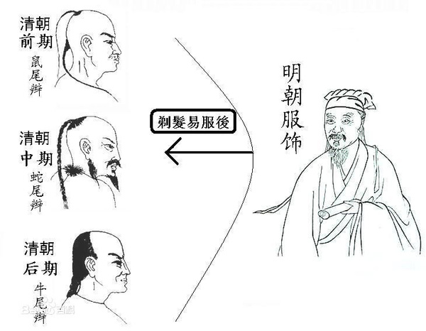 头上有没有辫子,成为两大民族的明显标志。满族入主,就以主人的气焰,要汉族人一律留辫子。最初入关时就下过这命令,但当时满族统治未稳固,在人民剧烈反抗之下一度收回成命。到顺治二年六月,清朝就对征服的地区下了严厉的命令,限期剃发。命令说:“自今布告之后,京城内外,限旬日,直隶各省地方,自部文到日,亦限旬日,尽令剃发,遵依者为我国之民,迟疑者同逆命之寇,必置重罪”。
