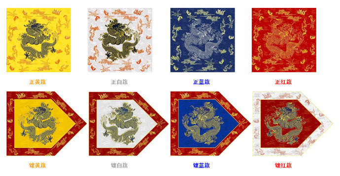 1614年因“归服益广”将四旗改为正黄、正白、正红、正蓝,并增设镶黄、镶白、镶红、镶蓝四旗,合称八旗,统率满、蒙、汉族军队。规定每300人为一牛录,设牛录额一人,五牛录为一甲喇(队),设甲喇额真(参领)一人,五甲喇为一固山,设固山额真(都统、旗主)一人,副职一人,称为左右梅勒额真(副都统)。 皇太极即为后为扩大兵源在满八旗的基础上有创建了蒙古八旗和汉军八旗,其编制与满八旗相同。满、蒙、汉八旗共二十四旗构成了清代八旗制度的整体。满清入关后八旗军又分成了禁旅八旗和驻防八旗。 正黄旗 以旗色纯黄而得名。正黄,镶黄和正白旗列为上三旗,上三旗内无王,都归皇帝所亲统,兵是皇帝亲兵,侍卫皇室的成员也从上三旗中选。至清末,是八旗满洲中人口最多的一个,下辖92个整佐领又2个半分佐领,约3万兵丁,男女老少总人口约15万人 镶黄旗 在今内蒙古锡林郭勒盟西南部。清代八旗之一,建于明万历四十三年(1615年),因旗色为黄色镶红边而得名,镶黄旗是上三旗之一,旗内无王,由皇帝所亲统,兵为皇帝亲兵,侍卫皇室的成员也从上三旗中选。清末时的规模是辖84个整佐领又2个半分佐领,约2.6万兵丁,男女老少总人口13万人。很多清皇室成员都是镶黄旗.如嘉庆帝的皇后孝和睿,乾隆帝的皇贵妃,“垂帘听政”的慈禧和慈安(也称东宫)都是,朝廷的高级官员中也有不少是来自镶黄旗的。 正红旗 在今内蒙古乌兰察布盟东部,清代八旗之一。建于明万历二十九年(1601年),因旗色为纯红而得名,正红旗是下五旗,由诸王,贝勒和贝子分统。至清末,是八旗中人口最少的一个旗,规模为下辖74个整佐领,兵丁2.3万,男女老少总人口约11.5万人。著名作家老舍先生原隶正红旗;清乾隆年间的大贪官和绅也是正红旗人。 镶红旗 在今内蒙古乌兰察布盟东部,清代八旗之一。建于明万历四十三年(1615年),因旗色为红色镶白而得名,镶红旗是下五旗之一,由诸王.贝勒和贝子分统。清末时规模达到下辖86个整佐领.兵丁2.6万,男女老少总人口约13万人。清光绪帝的宠妃珍妃就是镶红旗人。 正白旗 位置在内蒙古锡林郭勒盟南部。清代八旗之一。明万历二十九年(1601年),努尔哈赤初定,以旗色纯白而得名。正白旗是八旗中的上三旗之一‘顺治前,上三旗中并无正白旗而有正蓝旗,因在顺治初,多尔衮将自己所领正白旗纳入上三旗而将正蓝旗降入下五旗,这以后就成了定制。正白旗是皇帝亲统旗之一,旗内无王,兵为皇帝亲兵,并从中挑选侍卫皇室的成员。清末规模为辖86个整佐领(基本户口和军事编制单位,100—300人为一单位)约2.6万兵丁,男女老少总人口约13万人。清末代皇后婉容是正白旗人。 镶白旗 在今内蒙古锡林郭勒盟南部。清代八旗之一。建于明万历四十三年(1615年),因旗色为白色镶红而得名,镶白旗属于下五旗之一,不是由皇帝所亲统‘而由诸王,贝勒和贝于分统,清末时的规模是84个整佐领,约2.6万兵丁,男女老少总人口约13万人。 正蓝旗 在今内蒙古锡林郭勒盟南部,闪电河流贯,邻接河北。清代八旗之一。建于明万历二十九年(1601年),因旗色纯蓝而得名。正蓝旗在顺洁前与正黄,镶黄列为上三旗,顺治初,被多尔衮降入下五旗,不再由皇帝所亲统而由诸王,贝勒和贝子分统。清末时规模达到下辖83个整佐领又11个半分佐领,兵丁2.6万,男女老少总人口约13万人。 镶蓝旗 在今内蒙古乌兰察布盟东部。清代八旗之一。建于明万历四十三年(1615年),因质色为蓝色镶红而得名,镶蓝旗是下五旗,由诸王,贝勒和贝子分统。清末时规模达到下辖87个整佐领又一个半分佐领,兵丁2.7万,男女老少总人口约13.5万人。著名表演艺术家侯宝林先生便是镶蓝旗人。  |