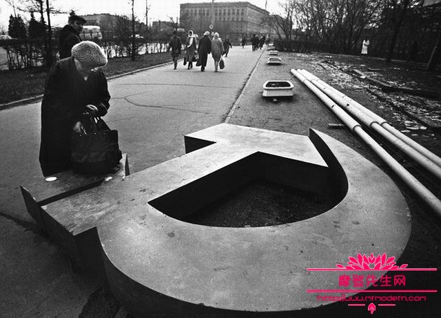 图注:1991年12月,莫斯科,老妇、倒下的镰刀与锤子
