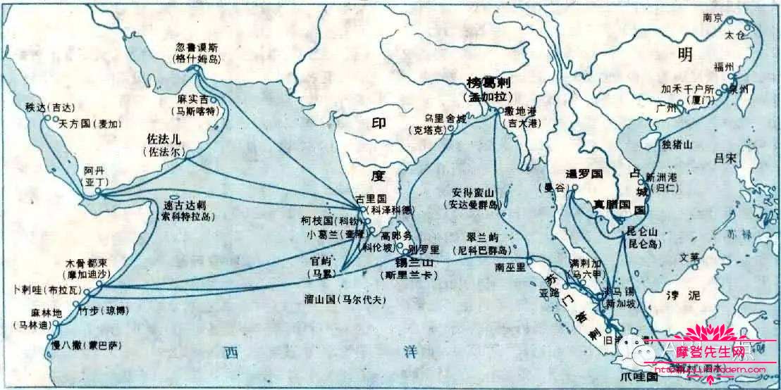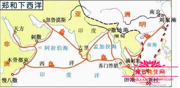 ![]() 历史上郑和七下西洋路线图 1405年7月11日(明永乐三年)明成祖命郑和率领庞大的二百四十多艘海船、两万七千四百名船员组成的船队远航,访问了30多个在西太平洋和印度洋的国家和地区,加深了中国同东南亚、东非的友好关郑和下西洋路线图系.每次都由苏州刘家港出发,一直到1433年(明宣德8年),他一共远航了有七次之多.最后一次,宣德八年四月回程到古里时,在船上因病过逝. ![]()