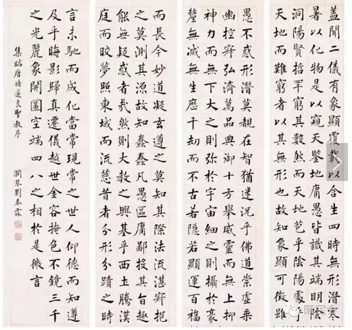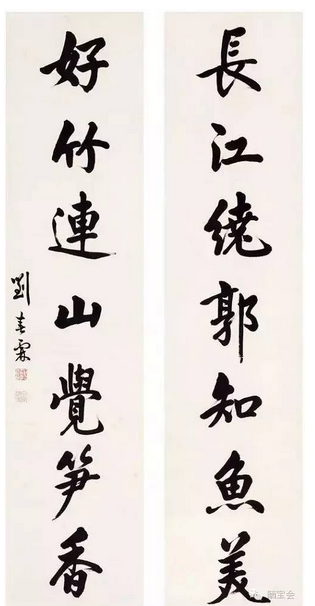 一般说来,写小字与写大字是大不相同的,其原则上是:写大字要紧密无间,而写小字必要使其宽绰有余。也就是说:写大字要能做到小字似的精密;而写小字要能做到有大字似的局促,故古人所谓“作大字要如小字,而作小字要如大字。”又苏东坡论书有“大字难于结密而无间,小字难于宽绰有余”的精语。刘春霖的书法,正是针对这种神情而发,显得经验老到,从他的这幅对联看出,他处理的重心与笔画配合非常巧妙,运笔圆润、娟秀、挺拔、整齐;而且字迹雄壮、厚重。下笔时用尖锋,收笔时用顿笔或提笔。每一笔都精心处理,笔画生动而有情致;点欲尖而圆,挑欲尖而锐,弯欲内方而外圆,钩半曲半直。运笔灵活多变,整篇字,要笔笔不同,而又协调一致,一行字写出来,错落有致,却又一直在一条线上,行 气自然贯串,如串串珍珠项链,神采飞扬。