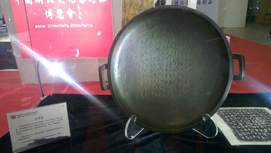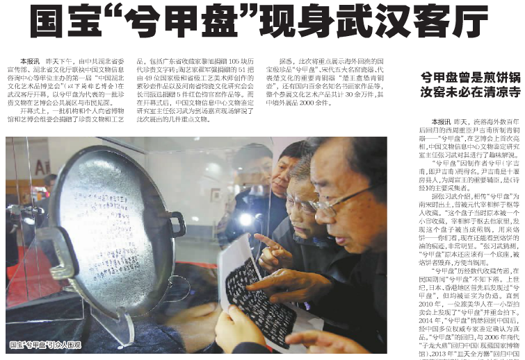 2014年11月7日,流落海外多年的“兮甲盘”“归国”后首次亮相武汉举行的中国(湖北)文化艺术品博览会,引起海内外关注。