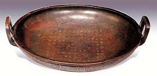 “兮甲盘”盘体呈圆形,盘沿边缘饰有花纹,底座圈足缺失。“兮甲盘”内底铸铭文133字,记述了周宣王伐严允(原作“玁狁”)的战争,获得战功而受赏赐一事。