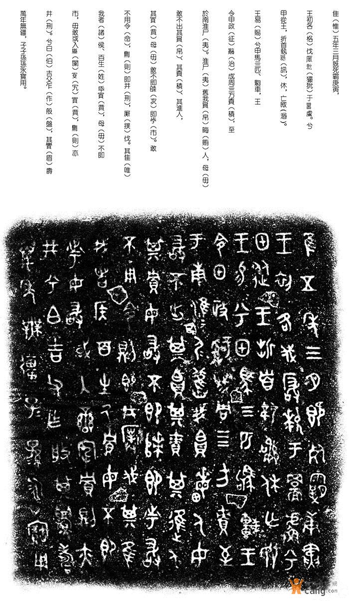 隹五年三月既死霸庚寅,王初格伐玁狁于(余吾),兮甲从王,折首执讯,休亡敃(愍),王赐兮甲马四匹、軥车,王令甲政(征)司(治)成周四方责(积),至于南淮夷,淮夷旧我帛畮(贿)人,毋敢不出其帛、其责(积)、其进人,其贾,毋敢不即次即市,敢不用命,则即刑扑伐,其隹我诸侯、百姓,厥贾,毋不即市,毋敢或(有)入蛮宄贾,则亦刑。兮伯吉父作盘,其眉寿万年无疆,子子孙孙永宝用。