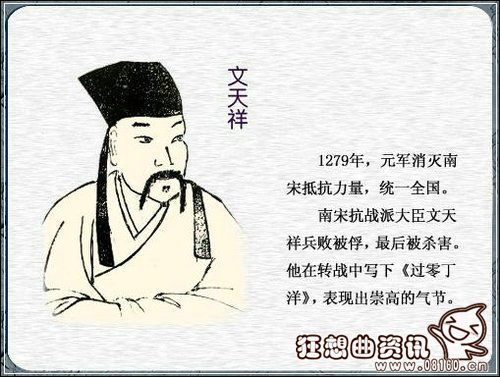 文天祥,吉州庐陵(今江西吉安)人,原名云孙,字履善,又字宋瑞,自号文山。1256年,20岁的文天祥由理宗皇帝亲定为601名进士中的状元。入仕后因奏迕宦官董宋臣、权相贾似道,被罢官。1275年,元军攻破长江天錾,文天祥散尽家私,组织义军赴临安勤王。次年,元军兵陈临安,当朝派文天祥出城讲和,被扣留,在押解北方的途中脱逃。1277夏,文天祥率军由梅州出兵,进攻江西,陆续收复了许多州县。1278年冬,文天祥在率部向海丰撤退时兵败被俘,服毒自杀未遂,被押送到大都。这时许多投降蒙古的南宋大员前来劝降,皆被文痛骂而去,元世祖又让降元的宋恭帝赵显来劝降。文天祥北跪于地,痛哭流涕的说:“圣驾请回!”文天祥被囚禁四年,经历种种严酷考验,始终不屈,“人生自古谁无死/留取丹心照汗青”的诗句就是在狱中所作。1283年文天祥被押解到北京柴市口刑场,临刑前文天祥跪拜南方,引颈就刑,从容就义,死时年仅47岁。一介儒生,铮铮铁骨,由此威震霄汉。