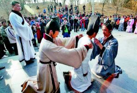 古时候,不论男女都要蓄留长发的,等他们长到一定的年龄,要为他们举行一次“成人礼”的仪式。男行冠礼,就是把头发盘成发髻,谓之“结发”,然后再戴上帽子。在《说文》里记载:“冠,弁冕之总名也。谓之成人。”在《礼记•曲礼上》记有:“男子二十冠而字。”意思是,举行冠礼,并赐以字。冠岁,意思就是男子二十岁了,说明他刚刚到了成人年龄,二十岁也称“弱冠之年”。