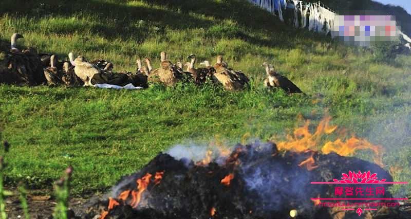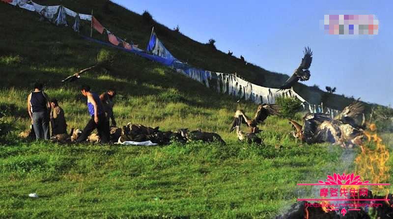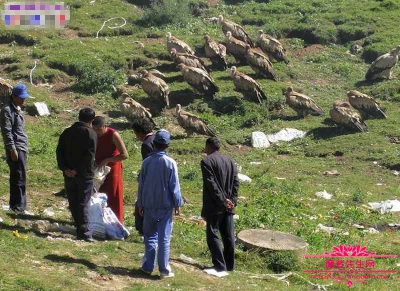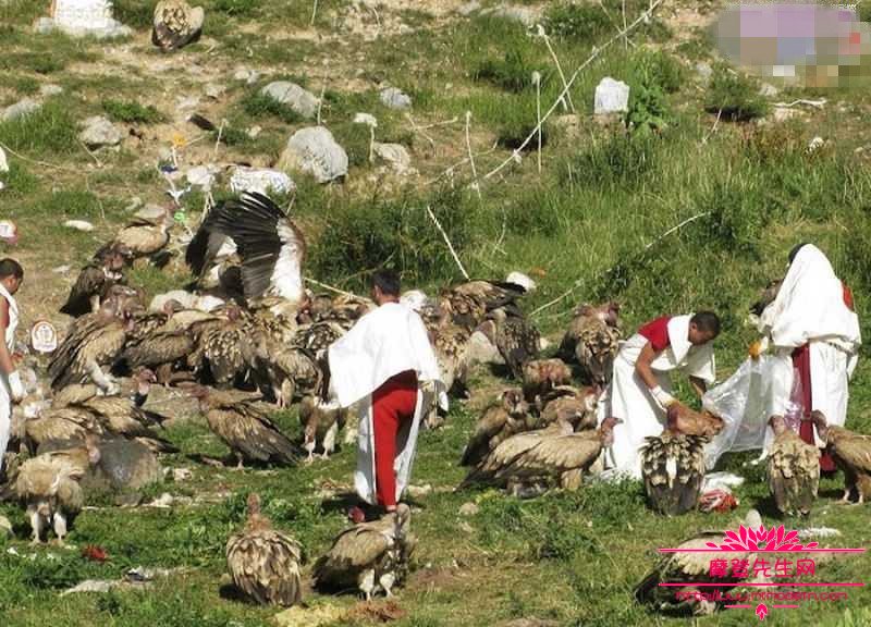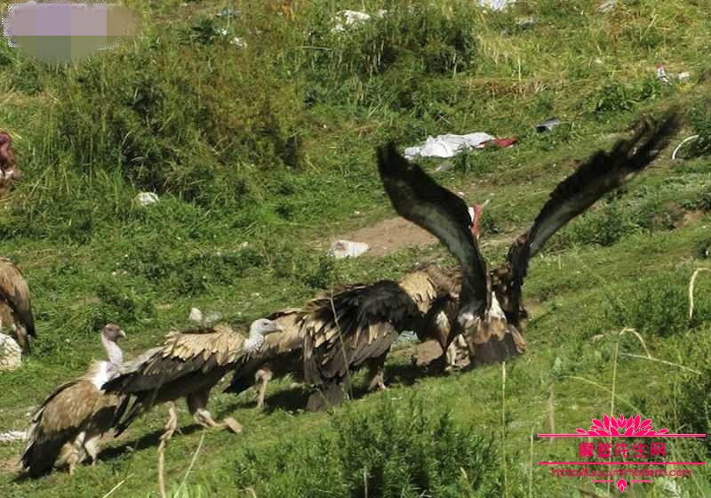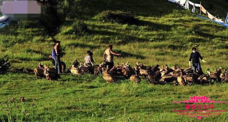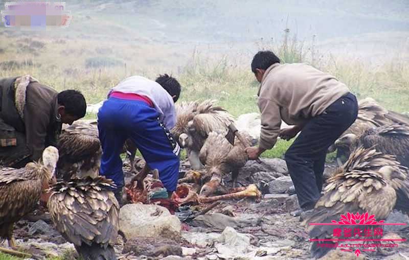 出殡时间一般很早,有专人将尸体送至天葬场。天葬师首先焚香供神,鹫见烟火而聚集在天葬场周围。随后天葬师将尸体衣服剥去,按一定程序肢解尸体,肉骨剥离。骨头用石头捣碎,并拌以糌粑,肉切成小块放置一旁。最后用哨声呼来鹫,按骨、肉顺序分别喂食,直到全部被吞食。 |