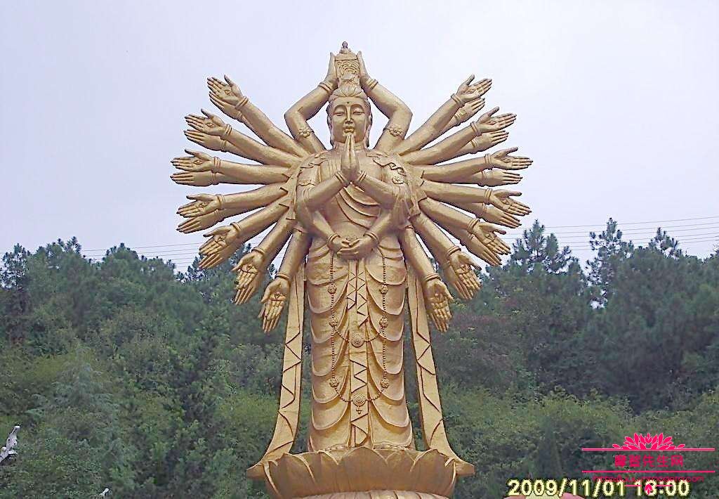 据佛教典籍记载,千手观音菩萨的千手表示遍护众生,千眼则表示遍观世间。唐代以后,千手观音像在中国许多寺院中渐渐作为主像被供奉。千手观音菩萨的形象,常以六手、四十二手等象征千手,每一手中各有一眼。