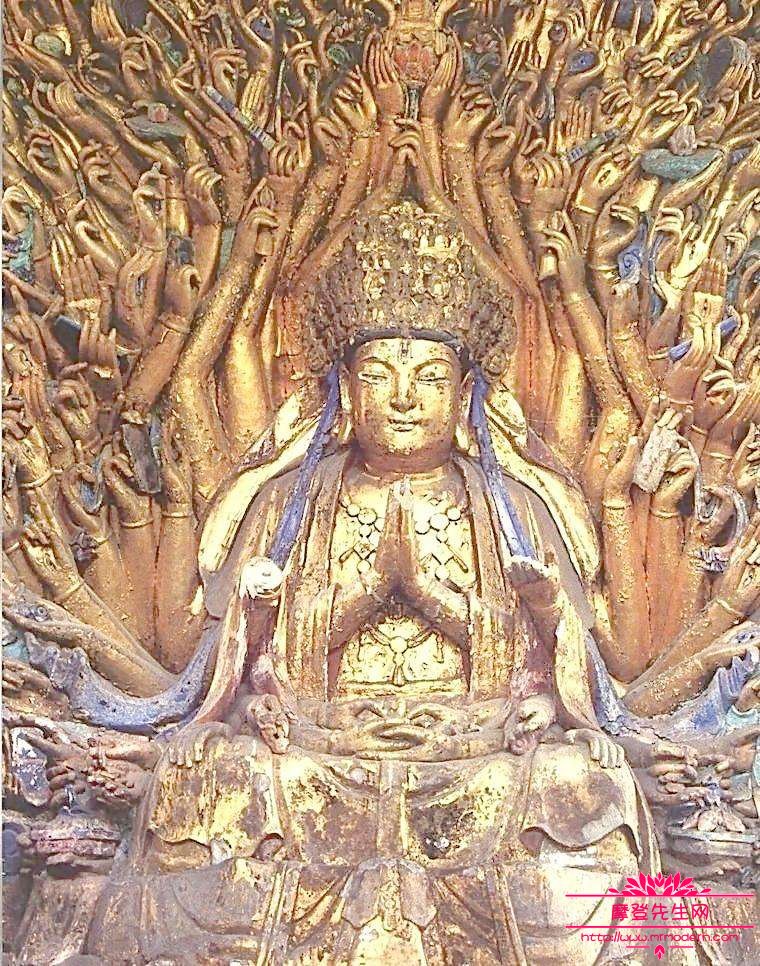 老师傅告诉我,千手观音的全称是“千手千眼观音”或“千眼千臂观音”,是密宗的六观音之一,地位仅次于佛。话说千手观音的出现,还有一段美丽的传说。