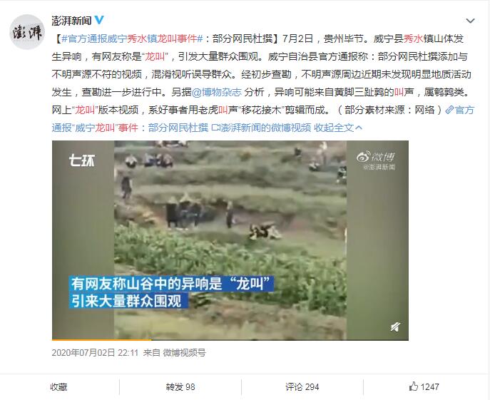 2020年7月份,有网友传闻贵州毕节威宁县秀水镇有怪叫传出,引得众多群众围观,甚至有人称这个叫声就是“龙叫”