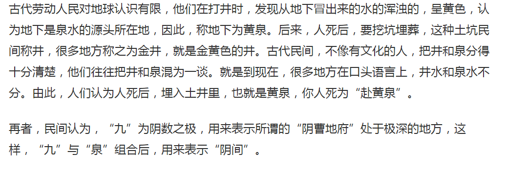 中国古代有很多带有“九泉”的成语,比如说“九泉之下”、“含香九泉”等,中国人对于“九”这个数字一直有着极重的情结,比如说“九霄”、“九天”、“九州”、“九五之尊”。而九泉和其他词语相比,更多了一种神秘色彩,那么到底什么是九泉呢?