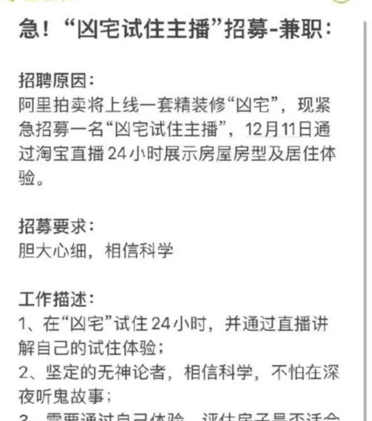 因为房价的飙升,现在年轻人表示已经买不起房子了,也因为房价高,租房更是艰难险阻,但是在一众高价的房屋里面,有一种房子,价格便宜各种好,只是它们是凶宅,在这里死过人的,不管是自杀还是他杀,总是房子是凶宅,吓人而且晦气,价格是合适了,但愿意来住的人还是少数,总觉得会影响自己的健康和命数,所以凶宅到底能不能住人?据说有一种凶宅试睡员,招聘在哪里。 凶宅到底能不能住人? 凶宅能住人的,科学验证了这个世界上是没有鬼怪的,大家的胆子可以放大一点,凶宅仅仅是此处死过人,人都死去好多时了,对屋主的现实影响是没有的。而且之前有新闻报道房子里面死人是在这一位租客入住两月之后才发现的,尸体从储物柜里面找出来的时候,租户吓坏了,但也跟尸体同住好两月了,这两个月里面没有任何的健康精神影响,可见凶宅在物理意义上是没有攻击性,影响力的。 凶宅之所以在大家的固有印象中不能住人,是因为人容易自己吓自己,胡思乱想之后就和鬼怪有了联系,其实之要在精神上自己安慰自己也就没什么了,最次的还可以和他们做朋友呀,帮忙关个灯,陪伴一下也是很不错的,毕竟又不是自己害死他们的,所以凶宅端看个人怎么看待,百无禁忌的人看凶宅就跟普通住宅没有区别了。 凶宅试睡员招聘在哪里 凶宅毕竟还是凶宅,不害怕的人毕竟还是少数,于是就产生了凶宅试睡员,这个职业目前在日本是非常多的,包住不说还有不菲的工资,很多年轻人趋之如骛,大趋势影响下,我国渐渐也开始了这个职业的招聘,其实一些招聘平台已经开始这方面的宣传招聘了,阿里平台还做了凶宅试住直播,一天有1441元呢,要求仅仅是胆大心细,相信科学。据说已经有上百人应聘,行情十分热火呀。
