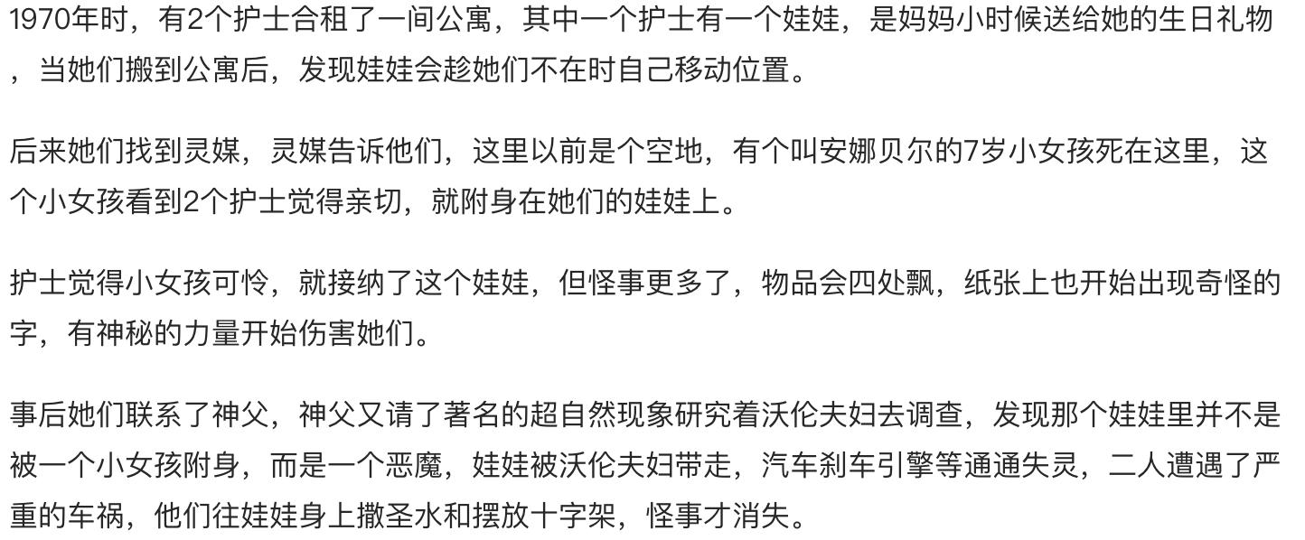 恐怖题材在大多数人的印象中,都是越做越烂的,现在已经很少有像《午夜凶铃》、《招魂》、《咒怨》等经典的恐怖电影了,其实《招魂》系列也是很受欢迎的,只是知名度不如《午夜凶铃》,在《招魂》中,有个鬼娃娃让人印象深刻,那就是安娜贝尔,那么安娜贝尔有原型吗? 温子仁被称为恐怖片大师,他的《招魂》系列曾经让很多人感到恐惧,在《招魂》系列中,那个诡异的娃娃让人感到十分不适,虽然说在《招魂》中,诡异娃娃出场并不多,但后来专门做了一个关于鬼娃娃的电影,叫做《安娜贝尔》 ,这部电影也是很恐怖的,据说是根据现实事件改编的。 据说鬼娃娃是有真实原型的,在1970年,一个叫做Donna的护士有一个娃娃,是她小时候收到的生日礼物,后来Donna和朋友一起合租了一个公寓,没想到在这个娃娃身上发生了很多诡异的事情,这个娃娃不但会自己移动,还会伤害到人类,后来护士就联系了教会,神父说娃娃里面有恶灵,后来进行了驱邪,而娃娃也被送到了博物馆。 而电影中的安娜贝尔的力量似乎更加强大,尤其是到了后来,就连十字架都控制不住它,其实这些都是编剧的创作,所以安娜贝尔不怕十字架,都是编剧的锅,当然也有可能是电影中的十字架的力量不够强大,所以才无法对娃娃造成伤害,不过真相到底如何,恐怕只有导演和编剧知道了。