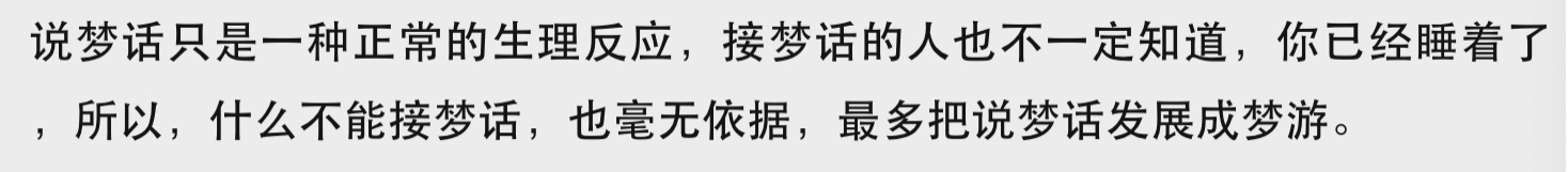 估计很多人都有和别人同宿的经历,可能是和家人,也可能是和朋友、同学等,比如说集体宿舍,学生时代的宿舍生活估计是很多人难忘的经历,也就是这样的集体生活,让我们知道每个人的睡眠习惯都是不同的,有的人睡觉的时候打呼、磨牙,甚至会说梦话、梦游,那么说梦话不能接是真的吗? 有些人在睡觉的时候有说梦话的习惯,他们在睡梦中有时会大喊大叫、哭笑或者唱歌等,其实大多数人的梦话,都是听不清楚的,发出的音也让人听不懂,只有少数人,在说梦话时吐字清晰,因此有说梦话习惯的人,很担心自己的秘密会在睡梦中说出来,那么梦话说的都是真的吗? 其实大多数说梦话的人,在清醒后都不记得自己说过什么,而人之所以会说梦话,是在深度睡眠后,大脑依然处于兴奋状态,而人说出的梦话,也只是大脑发出的指令而已,并不具备实际的意义,因此说梦话是一种不自觉的行为,并不能说是真的,只是可能和个人的心理因素有关。所以一些长期心理压力比较大的人,就会借说梦话来抒发自己的负面情绪。 一直有种说法,就是如果在说梦话的时候不能接话,否则他就醒不过来的,其实这种说法是不正确的,一般说梦话的人都是处于深度睡眠状态,所以对外界的反应很迟钝,所以可能听不到别人接话,因此说梦话的时候接话是基本上没有问题的,而之所以不推荐人们接梦话,是怕打扰说梦话人的睡眠效果,毕竟在睡梦中被叫醒是很痛苦的一件事。