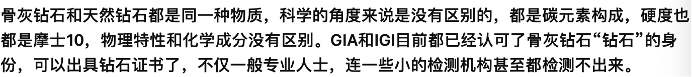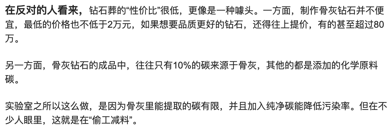人死后到底会怎样?估计很多人都思考过,畏惧死亡并不是一件难以启齿的事情,并不是每个人都能坦然接受死亡的,尤其是年纪越大的人,就越能感受到生命的流逝,所以面对亲人的离世,很多人都是非常无力的,总是想要想尽办法留住他们,哪怕知道这只是一种心理安慰。 现在很多国家都流行火葬,这和中国传统丧葬习俗是背道而驰的,因此很多人都觉得这种方式很难接受,但是国外的火葬是很流行的,他们甚至还发明了一种特别的钻石,叫做骨灰钻石,就是用人死后的骨灰做成钻石,他们觉得这种方式比做到骨灰盒中有意义得多。 其实市面上对于骨灰钻石的看法,也是毁誉参半,有人支持有人反对,反对者认为骨灰钻石中的真正的骨灰并不多,其他都是化学原料合成的,所以认为是一场骗局,而支持者则认为,骨灰钻石留在身边,是对逝去人的怀念,而且骨灰钻石中的碳元素,就是用骨灰提炼出来的,所以不是一场骗局,因为支持者和反对者都很多,至今仍没有明确的说法。那么骨灰钻石的造价是多少钱? 其实反对者之所以对骨灰钻石不满,还因为它的造价过高,目前国内还没有掌握这种技术,所以只能去国外制作,而这往往需要很长的时间,据说一克拉的骨灰钻石,需要80万美元,而市面上的制作钻石骨灰的价格,也是没有明确的价格,据说最低的价格不低于两万元,最高则没有上限。