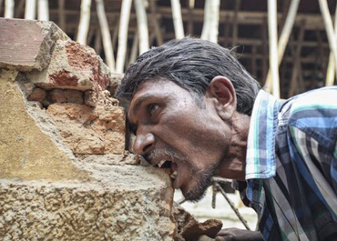 印度男子吃砖头上瘾 每天啃食3公斤 印度卡纳塔克邦一名30岁的男子Pakkirappa Hunagundi对正常的餐食不感兴趣,却热衷于每天吃掉3公斤左右的砖石、泥土,并称身体无任何不适。