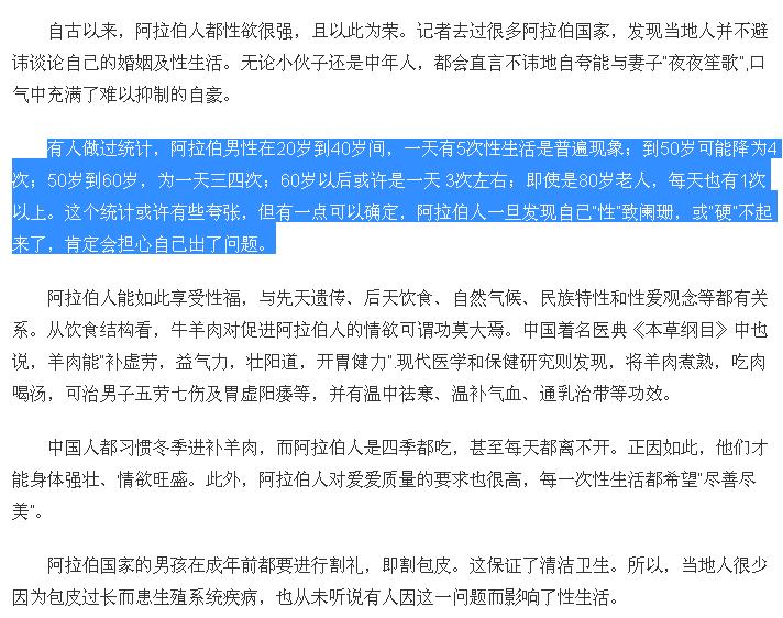 阿拉伯一夫多妻男人怎样睡? 首先咱们说明一点,虽然阿拉伯国家可以一夫多妻,但是实际上现实中真正一夫多妻的都是有钱人,没钱的人还是老老实实的娶一个老婆过日子吧! 然后咱们谈谈阿拉伯国家一夫多妻男人是怎么睡的。 ![]() 1、大多数一夫多妻制的家庭都是采用轮流睡的方式。 阿拉伯国家的男人对待自己的多个妻子都是公平的,既然娶回了家就要每个好好照顾,所以睡当然是轮流了,今天去这个的房间,明天去另外的老婆的房间。 就这样日复一日的轮流睡觉。 2、当然有一些阿拉伯男人比较会玩,可能今晚选择跟自己的两个老婆或者三个老婆一起睡。 这样的情况也是存在的,只要老婆们之间互相不介意,怎么睡都是由男人决定的,毕竟男人才是这个家庭的顶梁柱! 3、当然有时候男人也有权力选择自己在自己的房子里面睡,不跟任何人睡! ![]() 阿拉伯男人的能力真的很强吗: 阿拉伯男人能娶这么多老婆,很多中国人会有个疑问,就是他们是不是性能力真的很强悍,可以驾驭这些女人? 其实是真的,中东人的性能力非常的强悍,这主要跟他们的饮食有关系。 阿拉伯男人的性能力不光是每天都要做爱这么简单,他们年轻的时候居多每天都要做好几次,即便是到了七老八十也会保持定期做爱的习惯! |