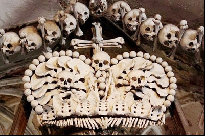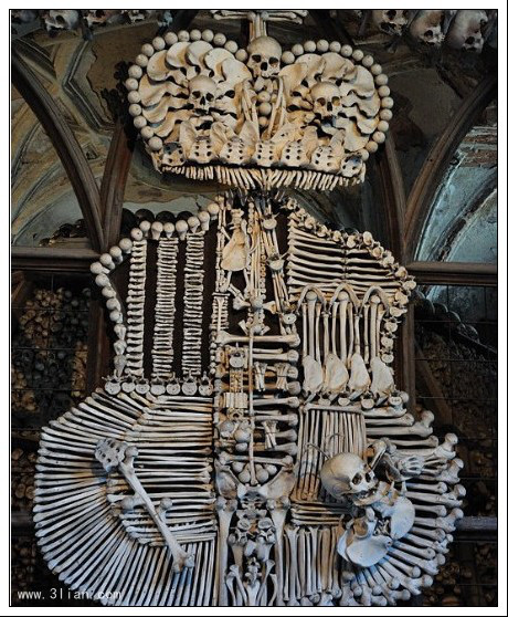 人骨十字架   人骨吊灯   全是人骨   捷克人骨教堂开发时间   人骨教堂的人是怎么死的 在十四世纪的二三十年代,一场突如其来的瘟疫席卷欧洲各地,并迅速向全世界蔓延。这场瘟疫造成全世界死亡人数7500万,欧洲的死亡人数达到了4000万左右,这无疑是人类史上的灭顶之灾!教堂内外尸横遍野,一个挨着一个的坟墓导致后来逝者无处安葬,再加上15世纪爆发的约翰·胡斯宗教战争,使得当地生灵涂炭。虔诚的传教士为了安抚在瘟疫和战乱中死亡的人们,想到了用人骨来装饰教堂的办法,既解决了遍地尸体无处安葬的难题,也让死者死后找到了灵魂的归处,才有了今天我们所看到的——人骨教堂。    |