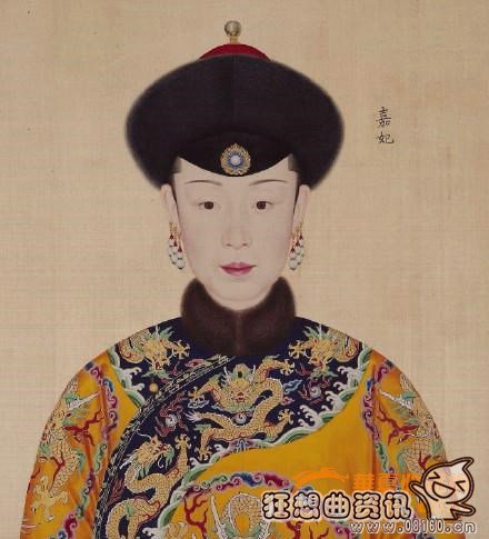嘉妃,即淑嘉皇贵妃金氏,上驷院三保女,吏部尚书金简之妹。初隶内务府汉军旗,后为正黄旗包衣人,赐姓金佳氏。金氏初入宫时赐号贵人,乾隆二年十二月封嘉嫔,乾隆四年生皇四子永诚,乾隆六年十一月晋嘉妃,画卷上的嘉妃像应为本年所绘。乾隆十一年生皇八子,乾隆十二年生皇九子。乾隆十四年晋嘉贵妃,乾隆十七年生皇十一子。乾隆二十年十一月十六日死,被晋为淑嘉皇贵妃(这位是朝鲜人)。
