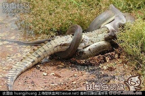 但是巨蟒就不同了,其紧紧缠住对象不放的力量大得惊人,可以把对象的肋都挤断。那么巨蟒用这招来对付鳄鱼,完全有胜算(鳄鱼也要呼吸嘛)。只不过鳄鱼皮肤比较厚,身体比较硬,巨蟒就得多花点力气和时间了,只要有恒心,即使不能把鳄鱼的骨头挤断,也能其窒息。 这也是为什么鳄鱼总是被蟒蛇吃的原因了。