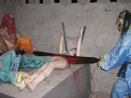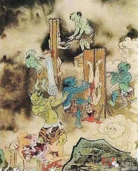偷工减料,欺上瞒下,拐诱妇女儿童,买卖不公之人,死后将打入刀锯地狱。把来人衣服脱光,呈“大”字形捆绑于四根木桩之上,由裆部开始至头部,用锯锯毙。