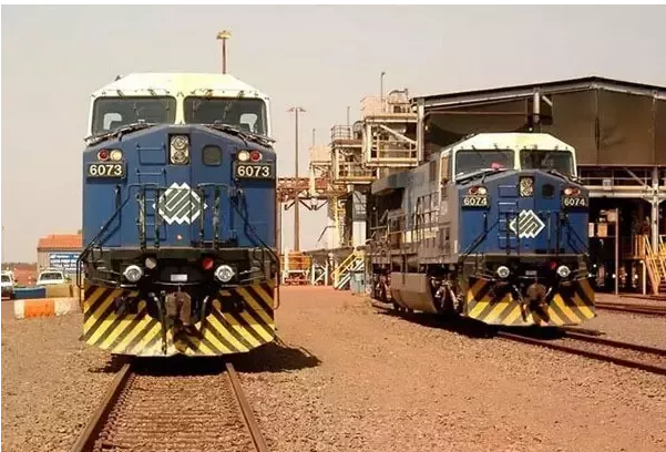 BHP的这8个车头和682节货厢分了四组——最前面是2个车头带着166节货厢往前冲;中间的4个分别拽着168节货厢紧跟其后;最后一组车头任务比较重,拖着180节货厢,所以一个在前面拉,一个在最后推。连车头带车厢一共690个,一个跟一个相互拽着,马不停蹄地从矿山奔往港口。