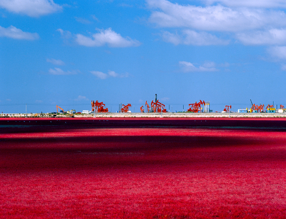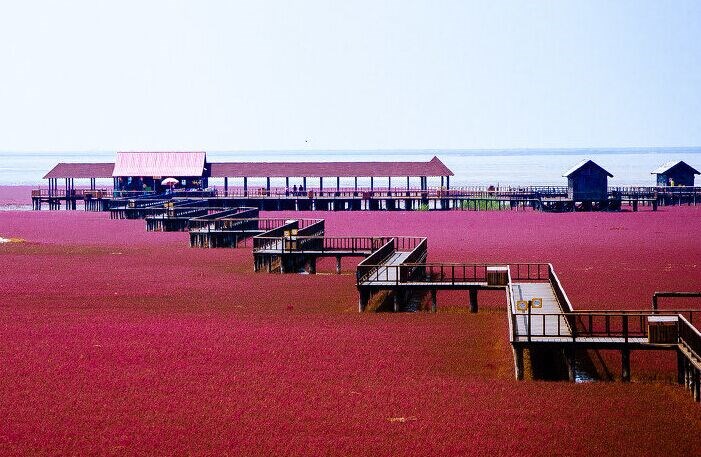 红海滩的红色是一种植物织的颜色。红海滩的成因,碱蓬草,大片大片的碱蓬草长在一起就汇聚成了红色的海洋,如果是在十月份,颜色更加鲜艳动人。