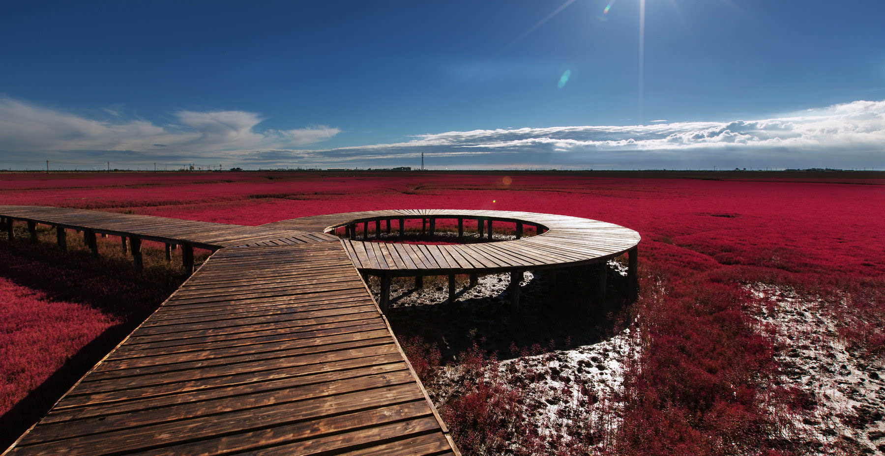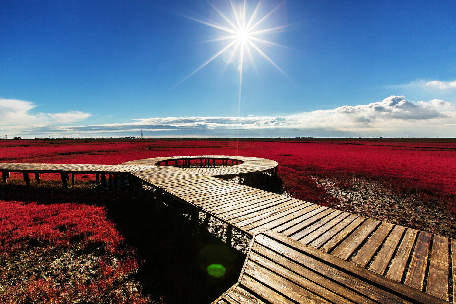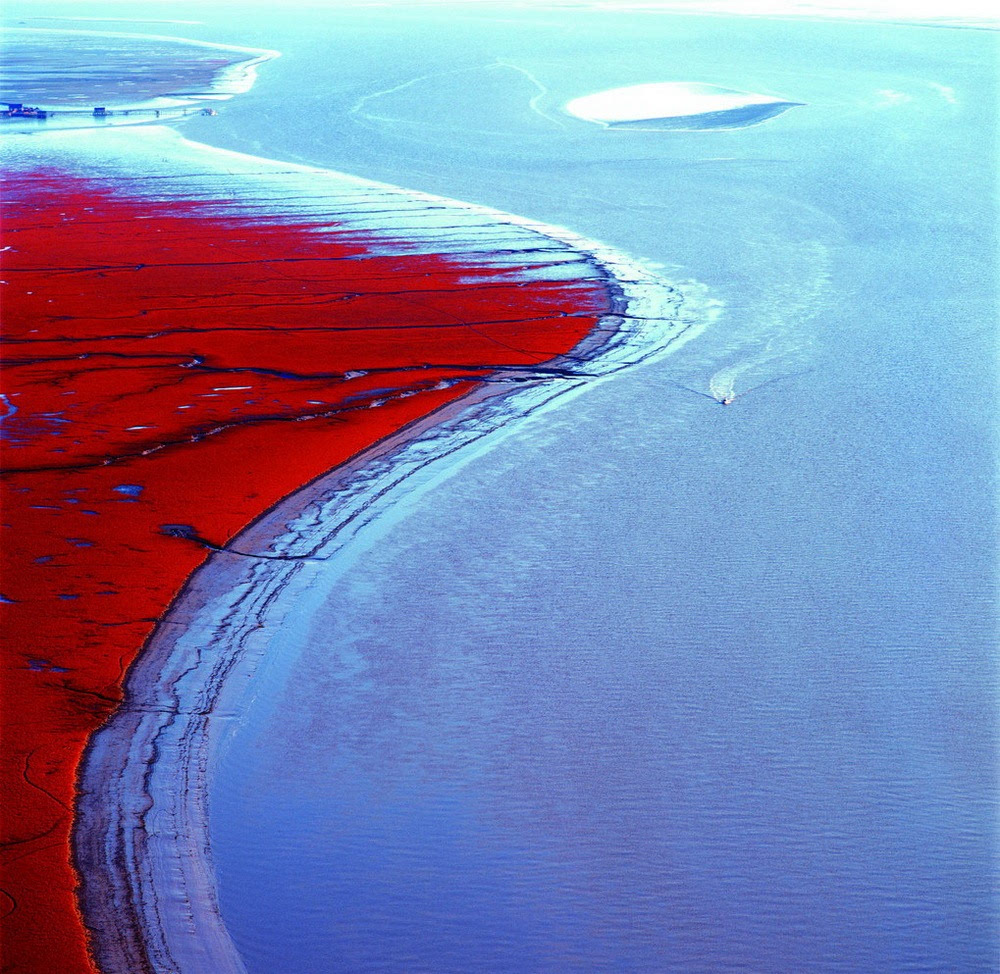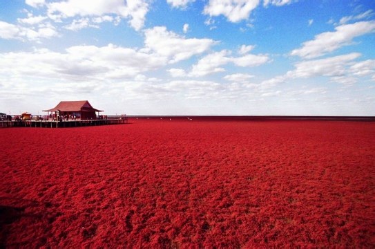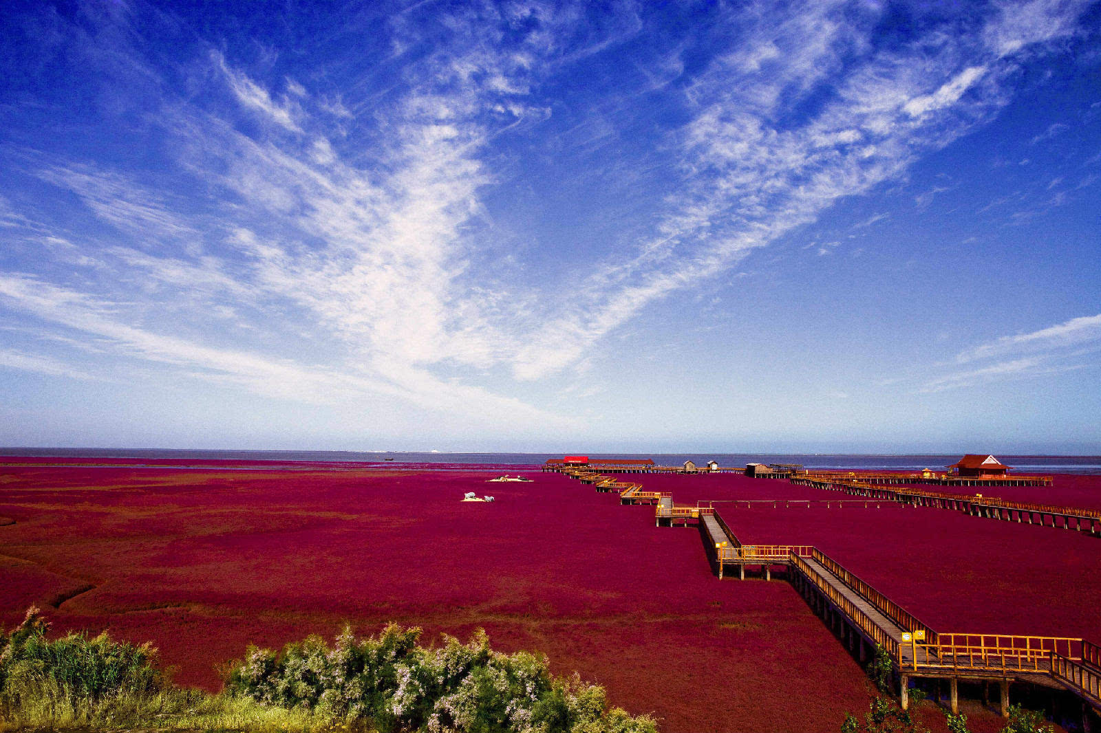 红海滩超美景色图片集合: ![]() 红海滩国家风景廊道以举世罕见的红海滩为特色,以全球保存最完好、规模最大的湿地资源为依托,以世界最大的芦苇荡为背景, 与数以万计的珍稀水禽和一望无际的浅海滩涂共同构成了一条生态风景廊道。 ![]() 织就盘锦红海滩的是一棵棵纤弱的碱蓬草--即一种适宜在盐碱土质--也是惟一一种可以在盐碱土质上存活的草。海的涤荡与滩的沉 积是红海滩得以存在的形式,盐的浸润与碱的渗透就是它得以红似朝阳的条件,火、红就是它生命的形式与内容,它无需人撒种,无需人耕种,在盐碱卤渍里,年复一年的生生死死,死死生生,于时光荏苒中酿造出一片火红的生命色泽。