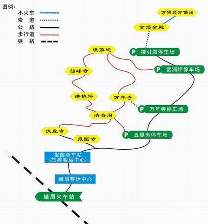 报国寺客运中心:由此可步行去报国寺、第一山亭、峨眉山博物馆、摩崖石刻、儒释道文化长廊、迎宾广场、“圣积晚钟”亭等景点游玩;