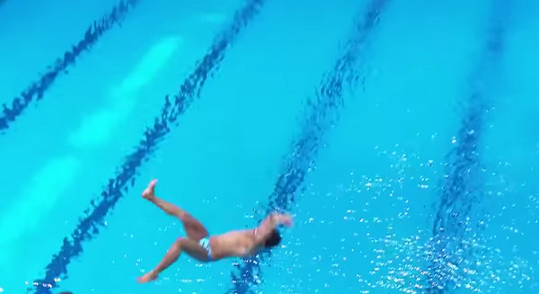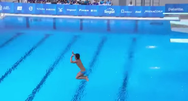 菲律宾跳水选手帕霍尤以双手投降状坠入水中。图片来源:台湾“东森新闻”。