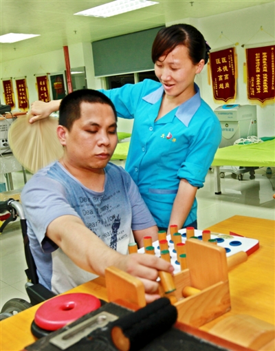 邱燕桦陪着丈夫做手脑配合康复训练。