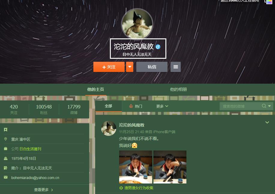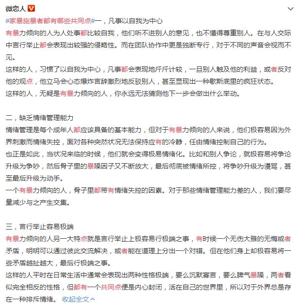 他的自我介绍可谓逆天,1975年4月18日出生的他自称:“目中无人,无法无天”,据悉,沱沱的风魔教原名光伟正,是一名摄影师,在不认识他的女人眼中,他是一个阳光、正直、善良的人,用宇芽的话说,几乎全世界所有的优点都在他身上体现,能嫁给他简直是自己赚到了!然后一旦落入其魔掌之后,噩梦逐渐袭来! ![]() 在宇芽曝光他的家暴行为之后,他的几位前妻也陆续出来为宇芽作证,原来前几任妻子离婚的原因都是因为家暴!而曾经沱沱的风魔教还以自己结婚离婚数次而感到骄傲,甚至拿出来晒自己的战绩! ![]() 通过下面的照片来看,是结婚了至少三次!宇芽是第三位受害者,在视频中前2任妻子也都出来作证说自己被沱沱的风魔教打过! ![]() 目前警方已经介入调查此事,家暴对女人来说简直是噩梦般的存在,如果不慎选择了一个家暴男,可谓一辈子都完蛋了,那么家暴的男人都有哪些特征呢?有心理专家做了详细的总结,一般家暴男有三个非常明显的特征:1、以自我为中心;2、缺乏情绪管理能力;3、言语举止容易走极端。如果你交往的男友拥有这三个明显的特征,那么你一定要小心点了! ![]() |
